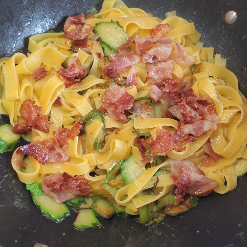 É uma das receitas de massa mais clicada: moderna, rápida e fácil de fazer. Aqui na Itália faz parte do dia a dia. Poucos ingredientes: abobrinha, bacon e alho. E parmesão para dar a cremosidade final