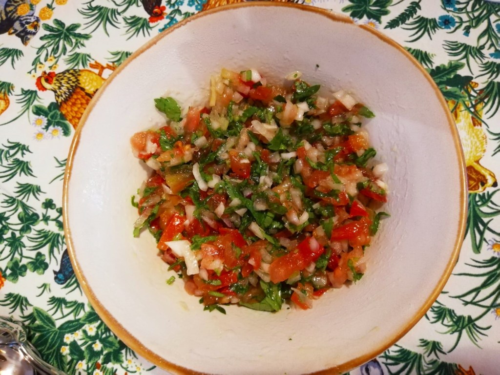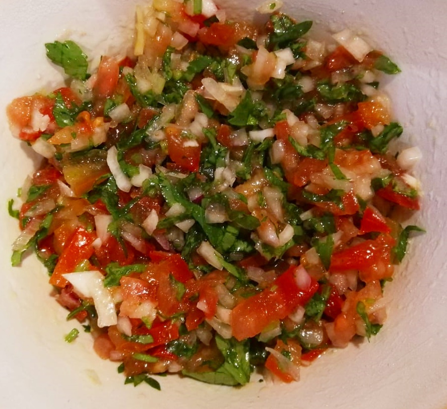 Picar bem as cebolas e os tomates e colocar em uma vasilha. Depois junte todos os outros ingredientes. Prove e aprove segundo seu paladar. Gosto com o sabor picante mais acentuado, colocando duas pimentas se necessário. Não deixe muito “líquido”.