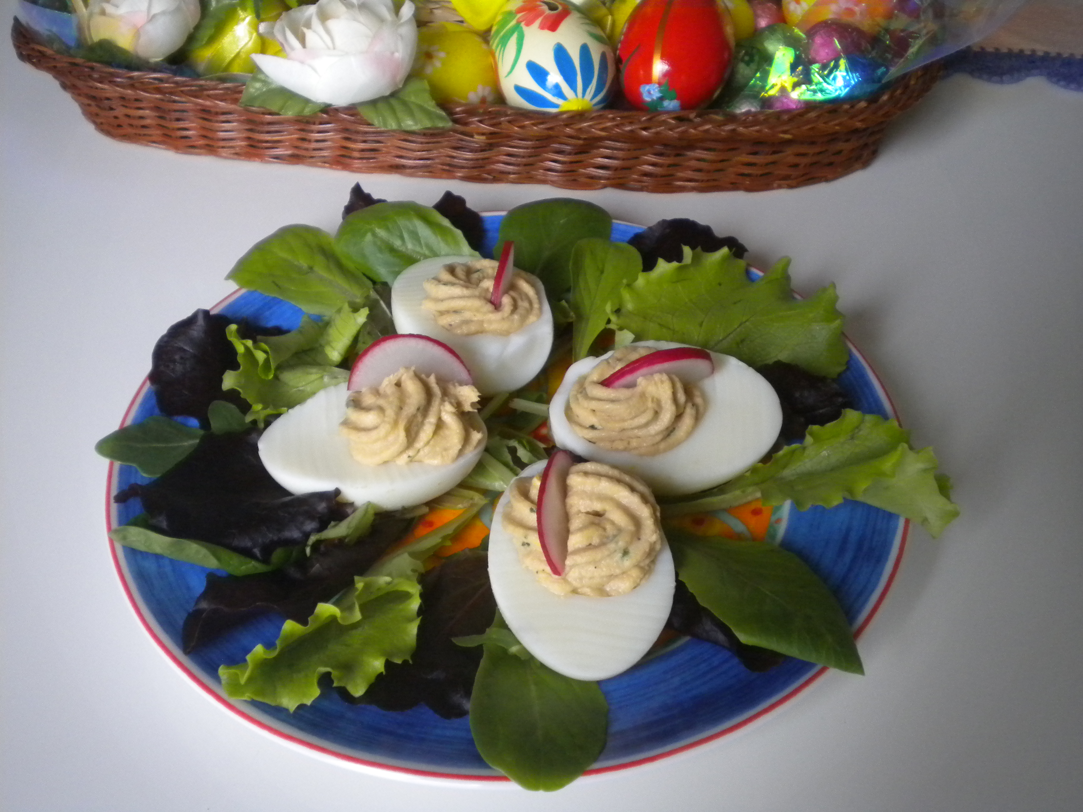 Ovos cozidos e recheados é uma entrada ótima e super fácil de fazer. Aqui faz parte da tradição tanto na Sexta-feira Santa como no Domingo de Páscoa. Esta receita é básica, pode-se decorar a gosto, usando tomates, salsinha, azeitonas etc. E o recheio também pode ser com camarão, siri, sardinha etc. O importante é a presença do ovo que significa sempre uma nova vida com a Páscoa.