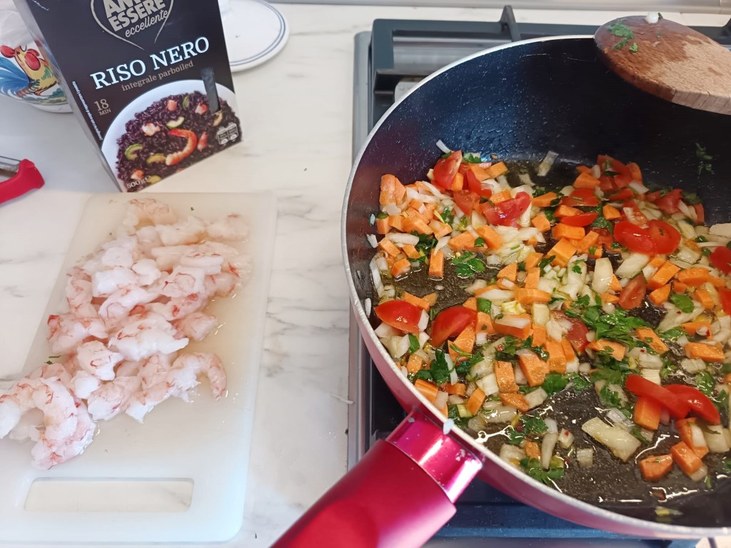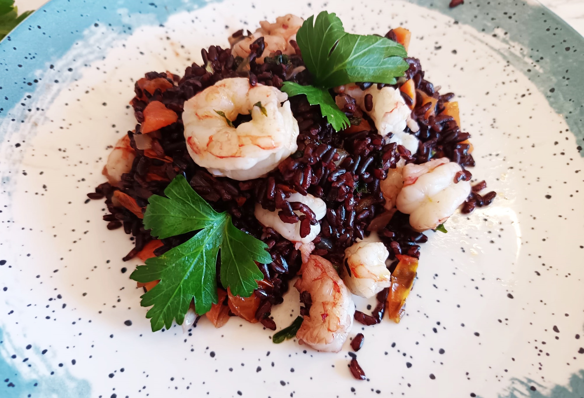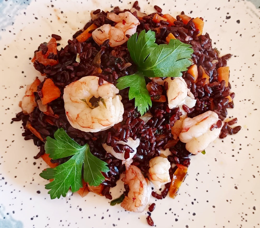 O arroz negro tem um sabor surpreendente, é um prato diferente mesmo. Além de ser super nutritivo, rico de proteínas e muitíssima fibra, tem mil combinações e dessas, com o camarão, é uma das melhores. Cozinhei o arroz como a massa e escorri, acho a técnica melhor, sem erro.