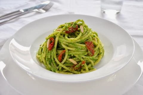 Misture ao creme de espinafre, cuidando para que fique bem cremosa, ponha a água da fervura se for necessário e os tomates secos picados. Sirva com os pinolis tostados para decorar.
