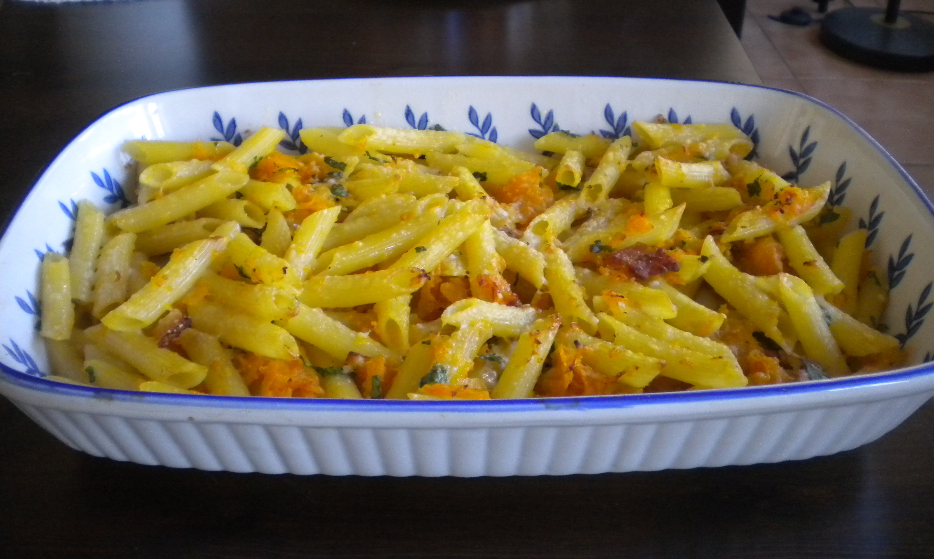 Uma idéia que vem do norte da Itália: “massa gratinada com abóbora”, um prato completo e com poucos ingredientes. Tem sabor muito gostoso e diferente pela combinação da abóbora com a noz moscada e o bacon. Gosto de preparar quando tem visita, porque dá para fazer antes e aquecer na na hora de servir.