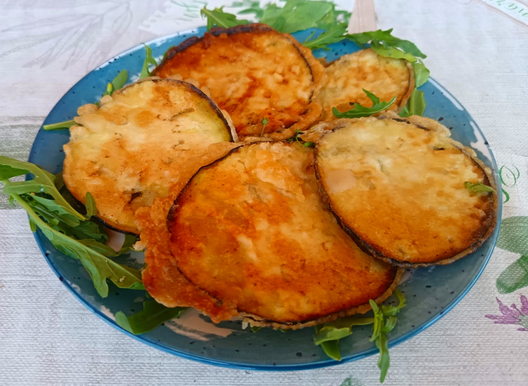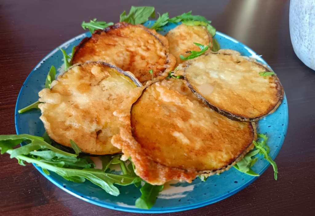 Aqueça o óleo em uma frigideira larga. Passe a beringela na massa gelada e frite-a até dourar ligeiramente.