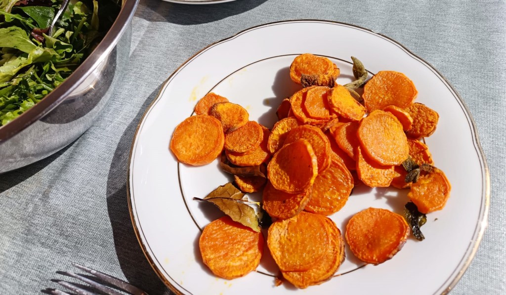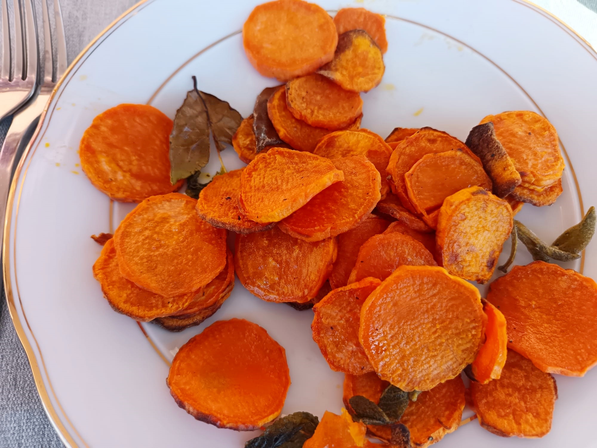 A receita é muito simples, para os fãs de batata-doce é sempre uma boa pedida. Sirvo como petisco (ótima com cerveja) e também como acompanhamento. Preparada deste modo fica super crocante e apetitosa. Aqui encontramos este tipo de batata doce, ou seja, com interno alaranjado.