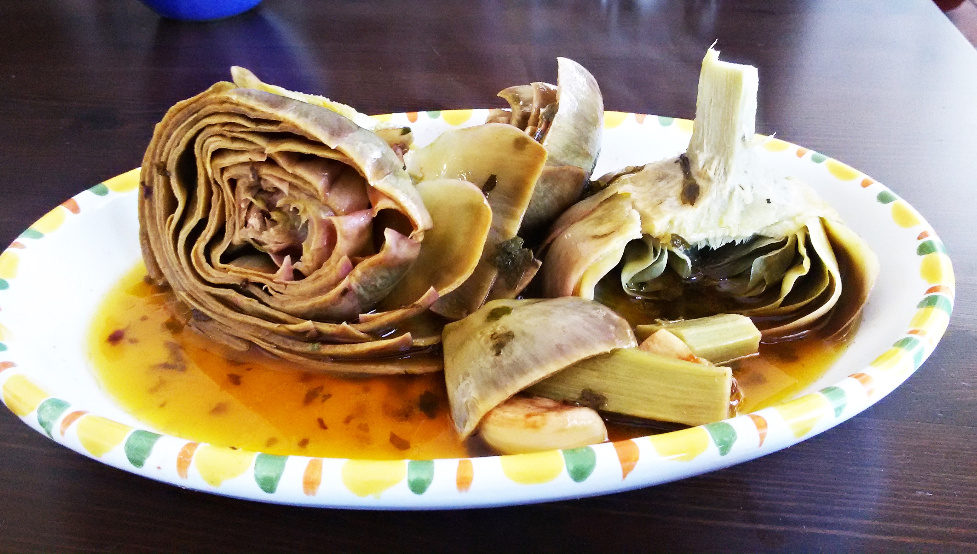A alcachofra é uma das verduras mais usadas por aqui, tem duas preparações fundamentais: à romana e à judia que é frita (maravilhosa). Também usa-se muito com massa, risoto e omelete que fica ótimo. É uma presença obrigatória no período de Páscoa. Esta receita “à romana” é a mais popular e eu logo que cheguei aqui aprendi e faz parte do nosso dia a dia. Existem vários tipos de alcachofras, a de Roma é mais redonda e gordinha (mammole), portanto mais suculenta e perfeita para esta preparação.