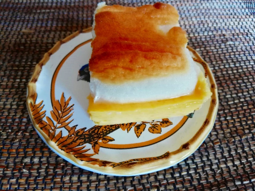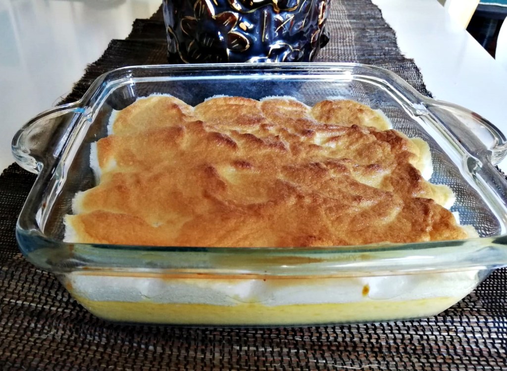 Agora tire o creme do forno, deixe amornar um pouco e coloque as claras em neve batidas por cima. Leve novamente ao forno para dourar as claras, cuidado porque logo ficam douradas.