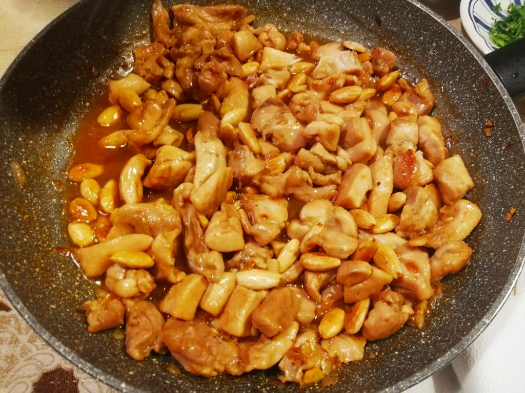 Acrescente o frango enfarinhado aos poucos e deixe dourar. Depois junte a água e o molho de soja. Cubra com uma tampa e deixe cozinhar 5 -7 minutos misturando de vez em quando.