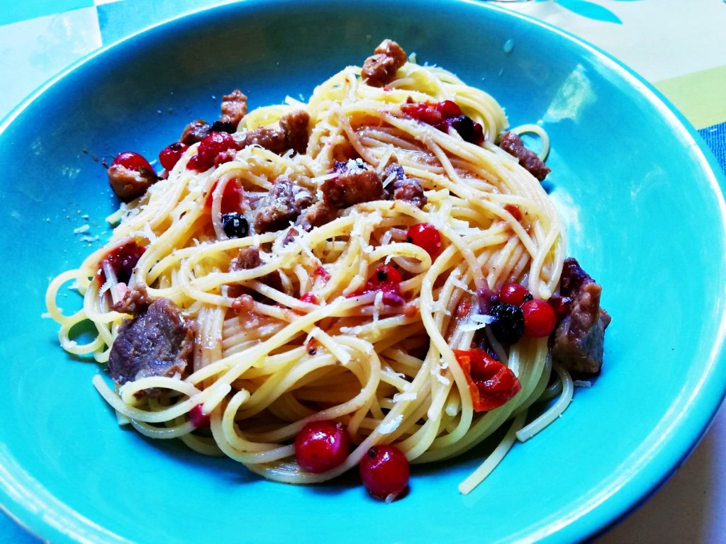 Comi essa massa em um restaurante no interior e fiquei surpresa com o sabor e a originalidade. A carne magra bem macia e as frutinhas vermelhas dão um equilíbrio perfeito para uma nova experiência culinária. Na receita original a massa é de farinha integral, se encontrarem massa seca integral fica melhor ainda, porque tem um sabor rústico!