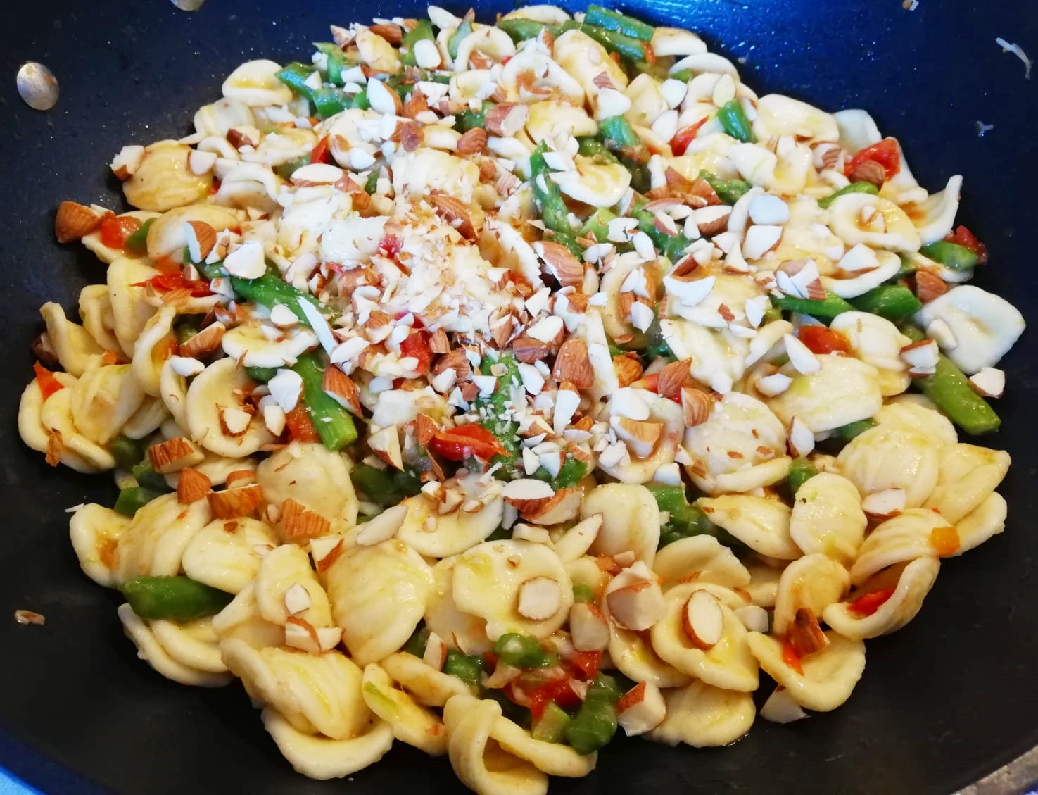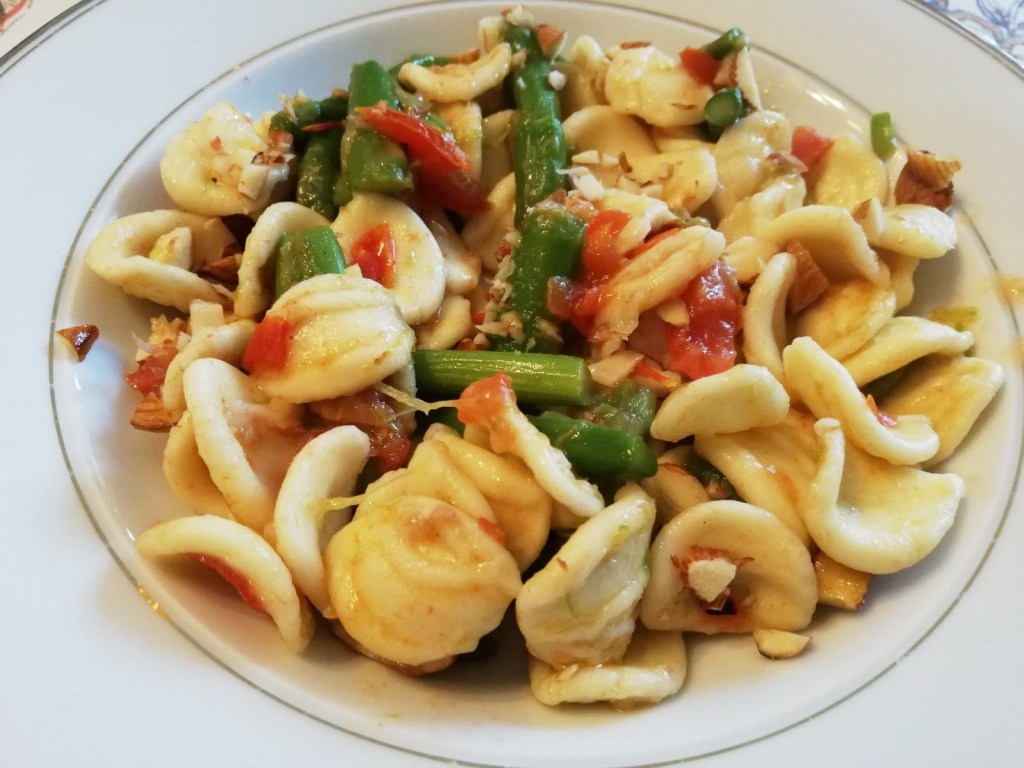 Mais uma combinação de bons ingredientes e preparação super simples. Bem típico da cozinha italiana. Pode ser usado com aspargos frescos, nesse caso precisa cortas a parte mais dura do caule, congelado que é mais prático e fica muito bom e em conserva que dá um sabor diferente, mas muito gostoso. Fiz com a massa chamada “orecchiette” (orelhinha, literalmente), mas pode-se fazer com todos os tipos de massa curta.