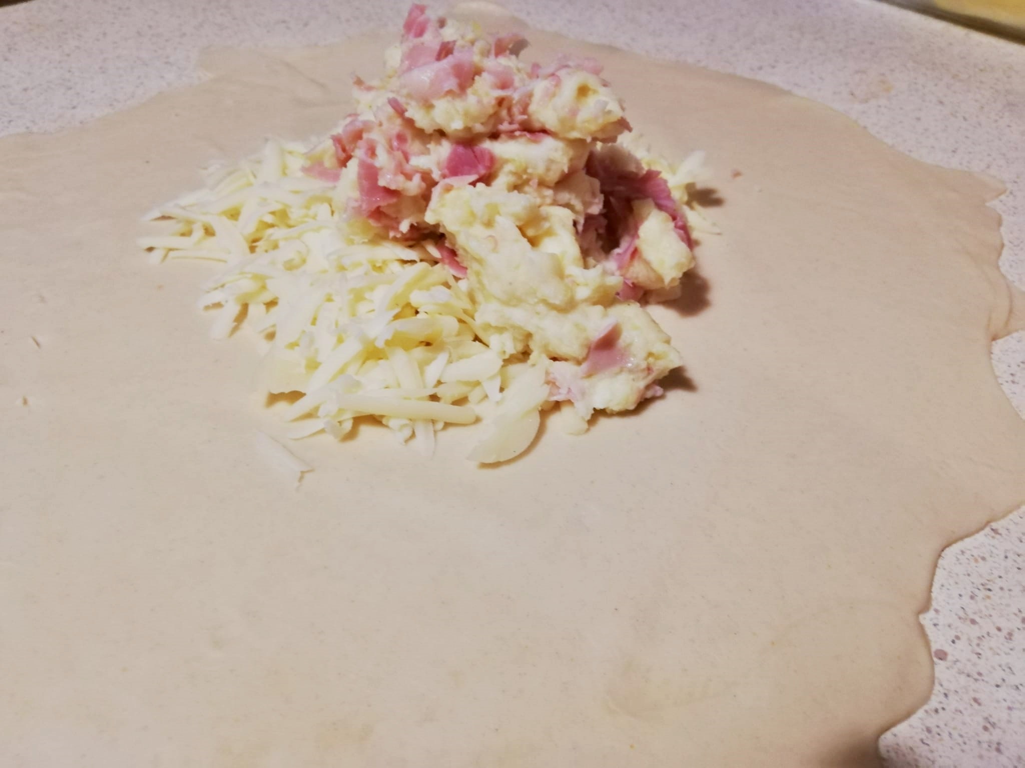 – Agora o purê de batata com o presunto e cubra com a outra metade do queijo.