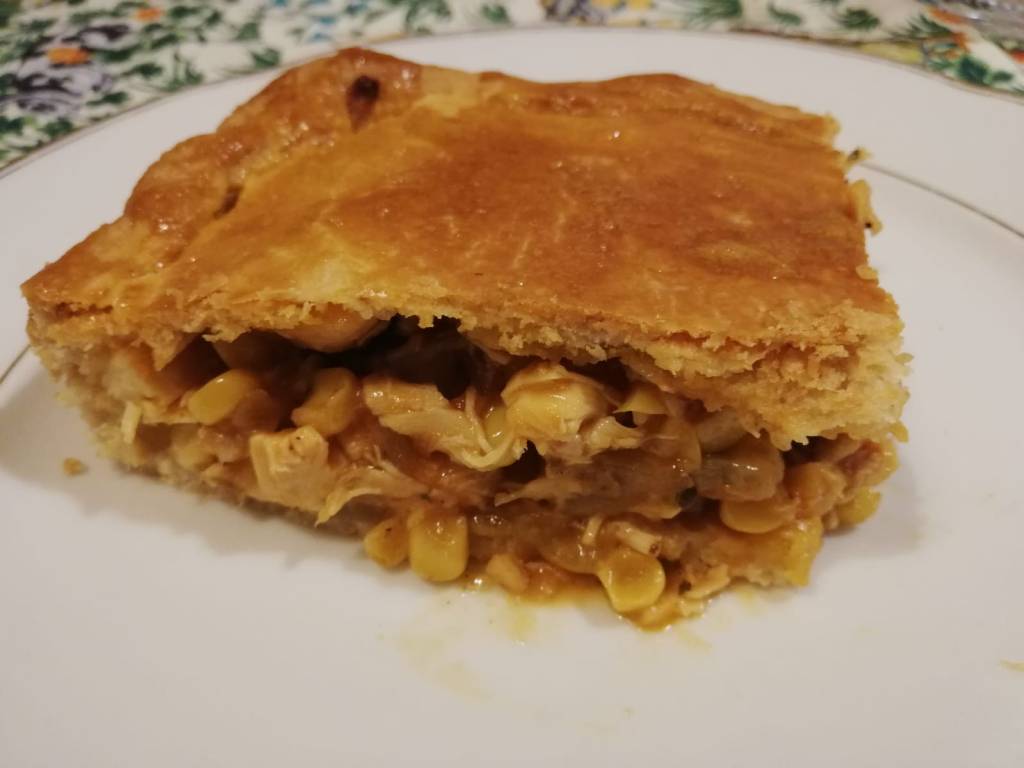 4. Abra a massa com um rolo e separe uma parte para a cobertura. Coloque em uma forma ou refratário que possa ir à mesa. Não precisa untar, porque a massa tem gordura. Coloque o recheio e espalhe de maneira uniforme. Agora cubra com a massa reservada faça buraquinhos com o garfo para sair o vapor. Pincele com um ovo batido para ficar dourado. Asse a 180 graus por 35-40 minutos, dependendo do forno.
