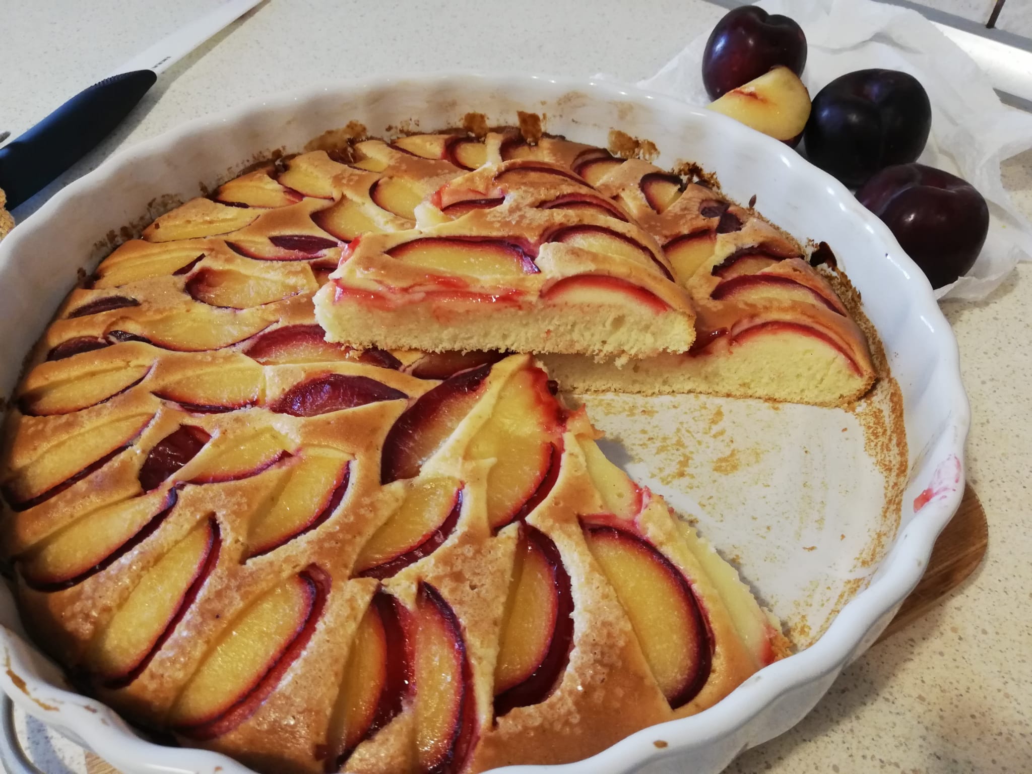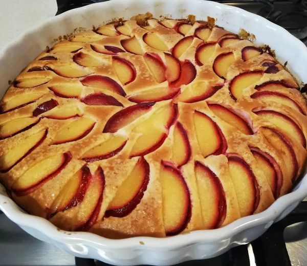 Corte as ameixas, com cascas, em fatias finas e coloque sobre a massa crua, cobrindo toda a superfície formando um círculo como na foto. Depois, polvilhe com açúcar normal ou amarelo (abuse).