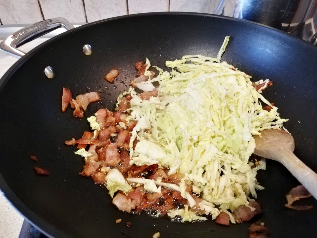 4. Escorra e junte ao repolho/bacon e misture bem, se ficar seco, use a água da fervura.