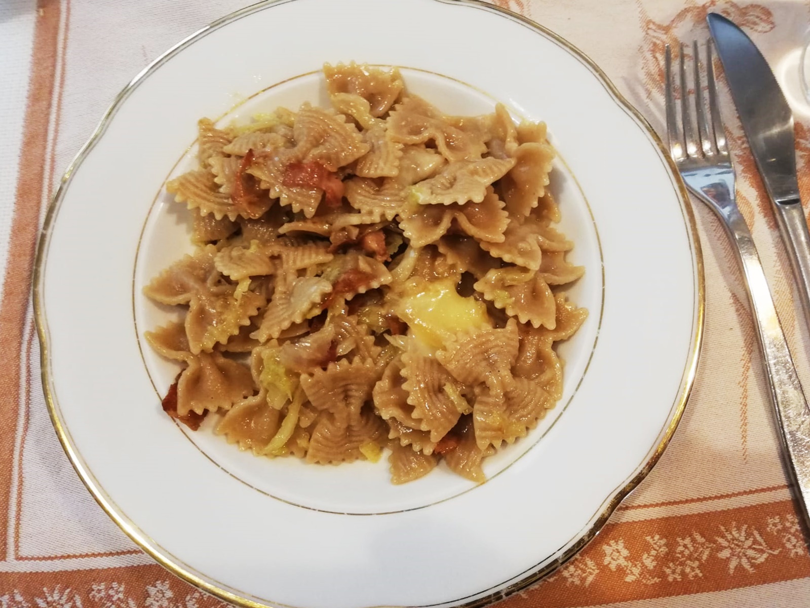 Essa massa é típica do norte da Itália. Fácil de fazer, rende muito com o uso do repolho e super saudável. Para os vegetarianos pode ser feita sem o bacon. O queijo em cubinhos dá o toque final.