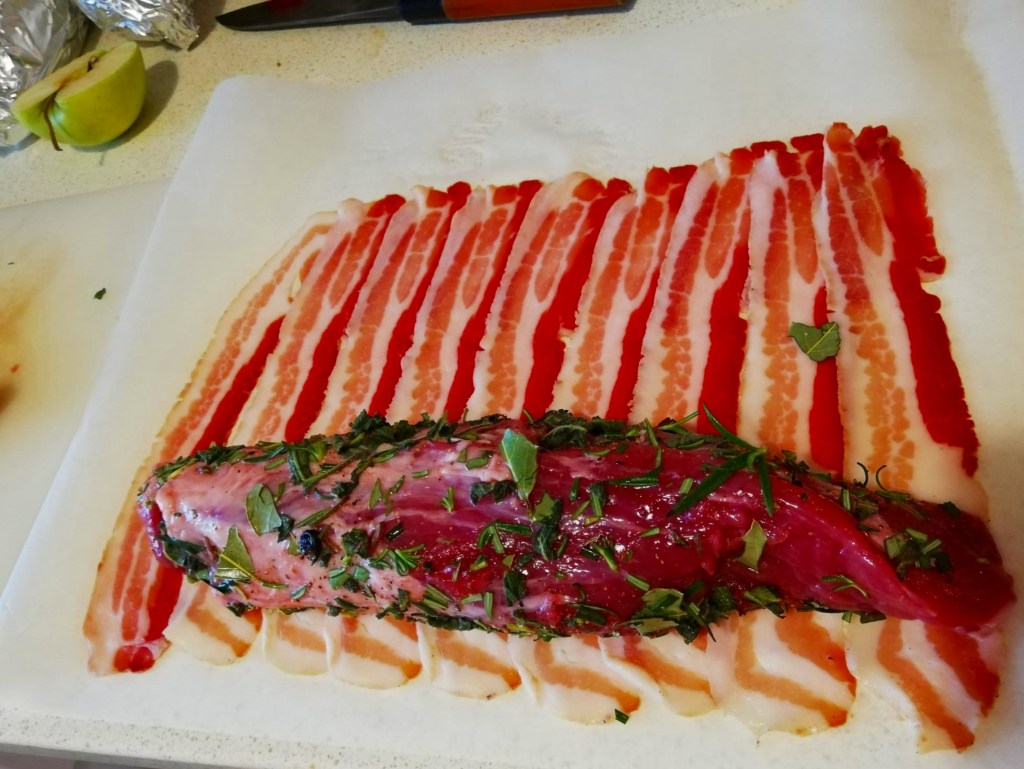 Coloque o filé com as ervas sobre o bacon, e com ajuda do papel manteiga, o enrole.