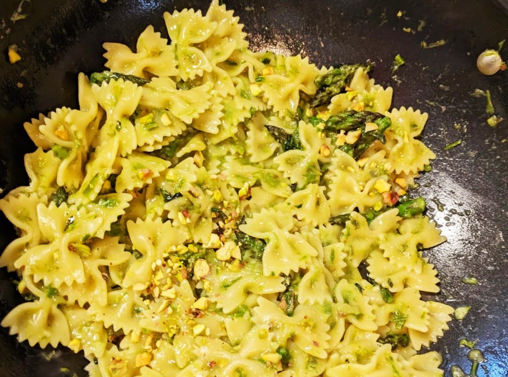 7- Coloque tudo na panela e “salte” a massa colocando a água da fervura se for necessário. Fora do fogo, junte o parmesão, misture parte dos pistaches picados e sirva com o resto dos pistaches por cima.