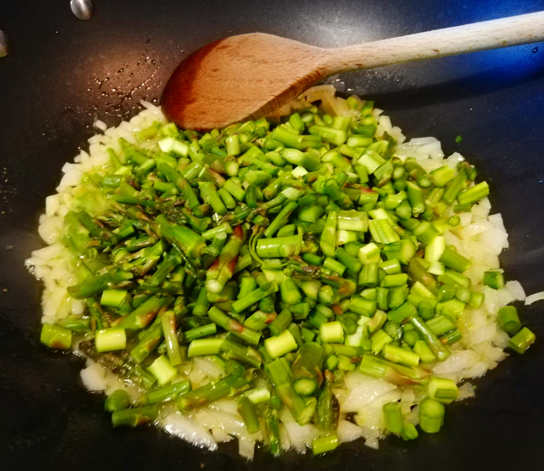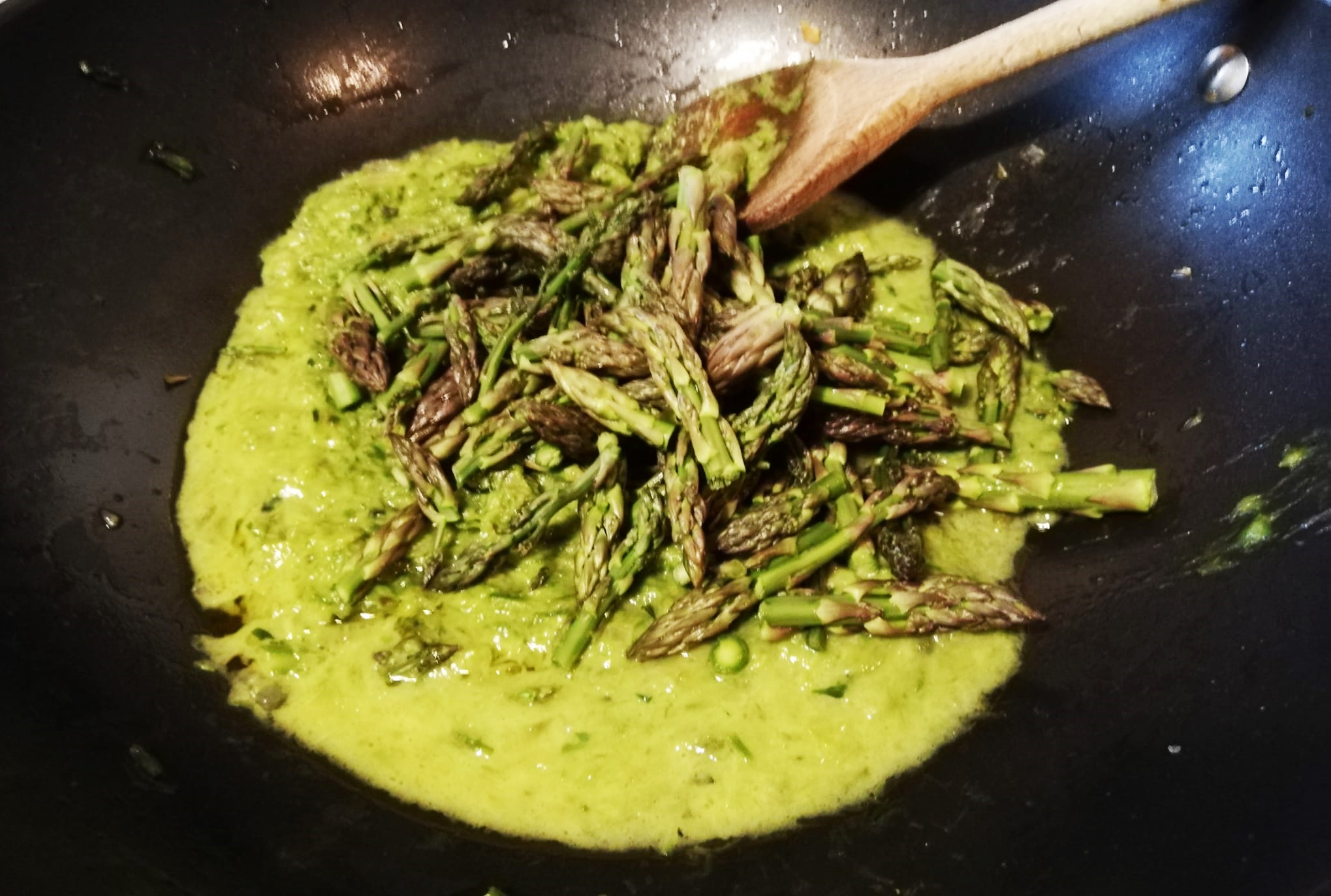 5- Leve de volta ao fogo e acrescente as pontas dos aspargos que estavam reservadas.