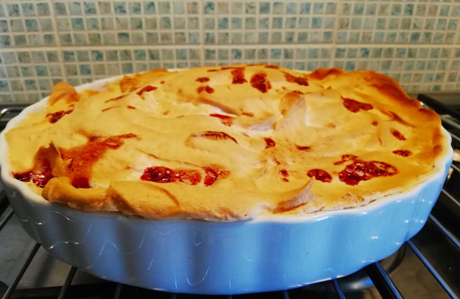 Agora tire o bolo do forno e cubra com as claras em neve e espalhe com a colher um pouco de geleia por cima e ponha no forno com o grill até ficar douradinho (cuidado para não queimar, demora uns 5 minutos).