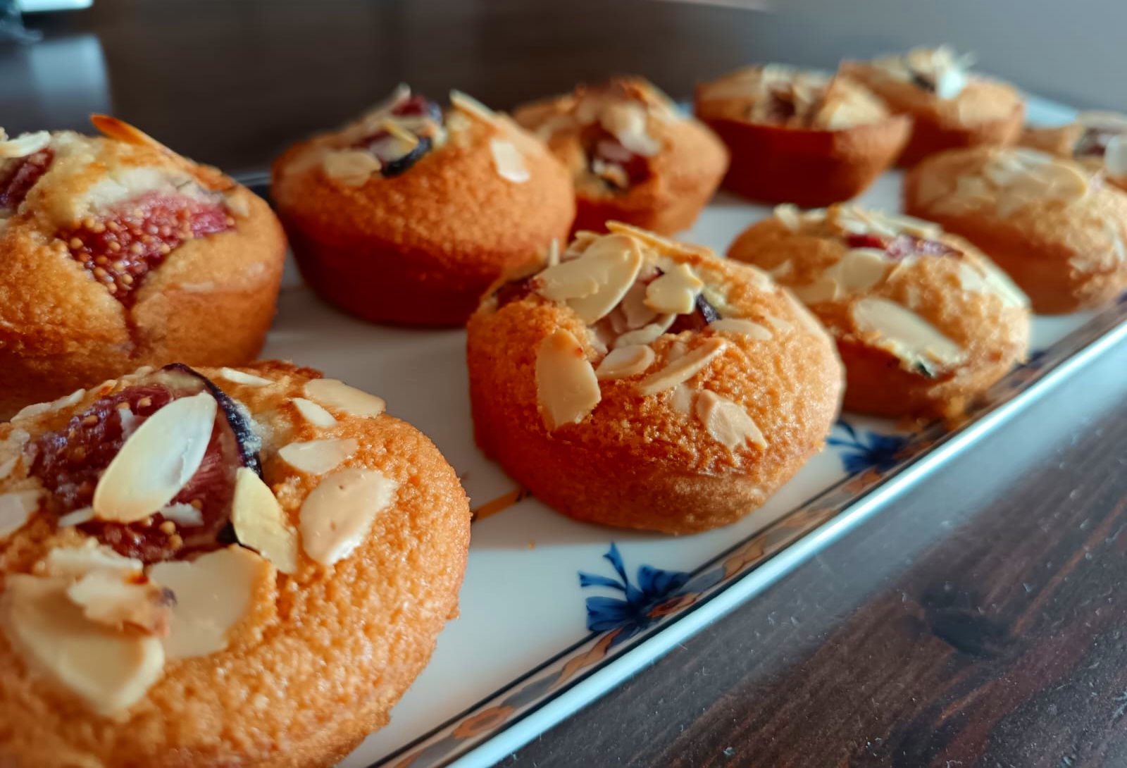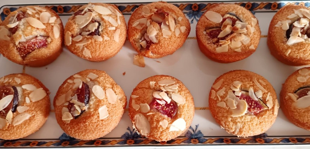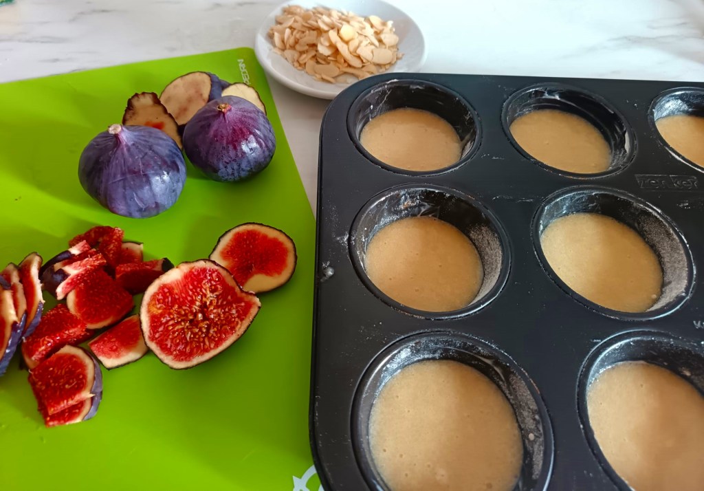 Coloque por cima dois pedacinhos de figo com casca e algumas “lâminas” de amêndoas (esse passo pode ser dispensável, só os bolinhos são divinos!).
