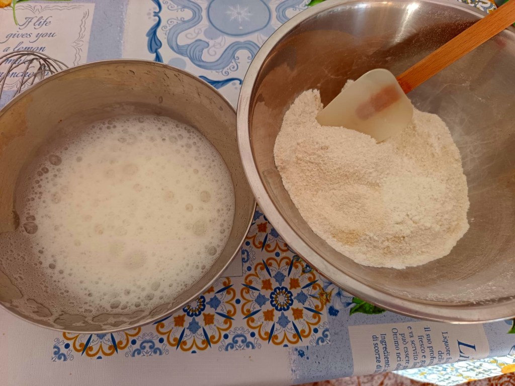 – Bata as claras em neve à mão, não há necessidade de batê-las até ficarem firmes e acrescente as claras batidas às farinhas e misture.