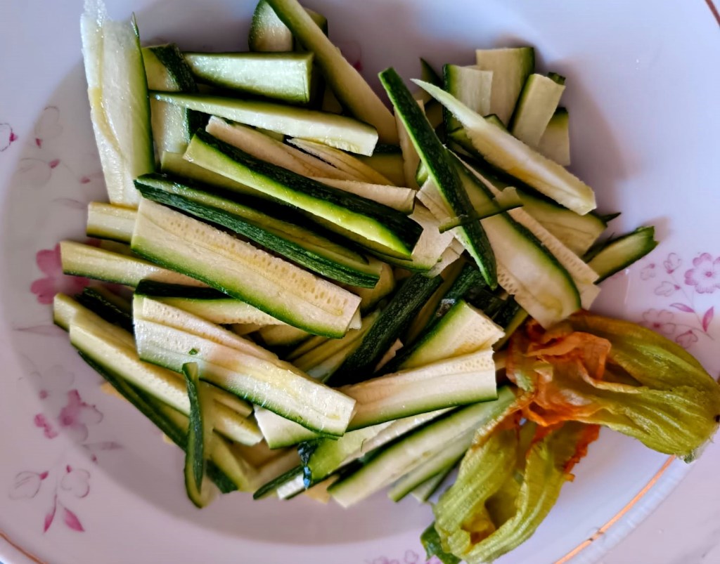 1 -Corte as abobrinhas em tirinhas finas e usando mais a parte externa e reserve.