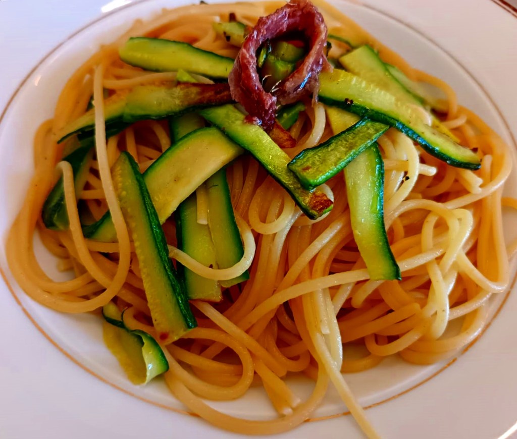 4 -Agora misture a massa na manteiga e aliche e acrescente as abobrinhas preparadas. Misture colocando água do cozimento para ficar cremosa. Está pronta! Impossível mais fácil 😊