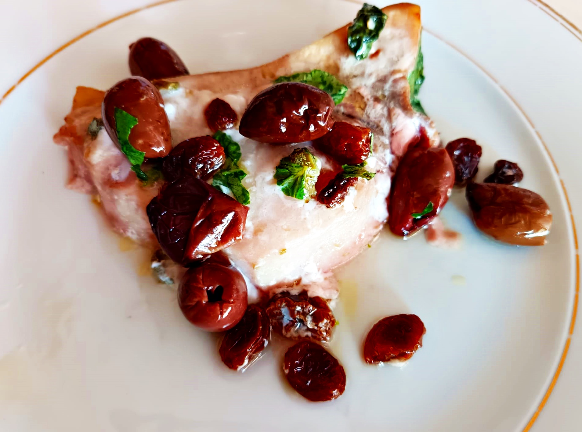 3. Frigideira bem quente, 2 colheres de azeite de oliva (apenas o suficiente para lubrificar) e coloque o peixe. Junte as azeitonas, um minuto de cada lado, depois acrescente as uvas-passas e deixe mais um minuto.