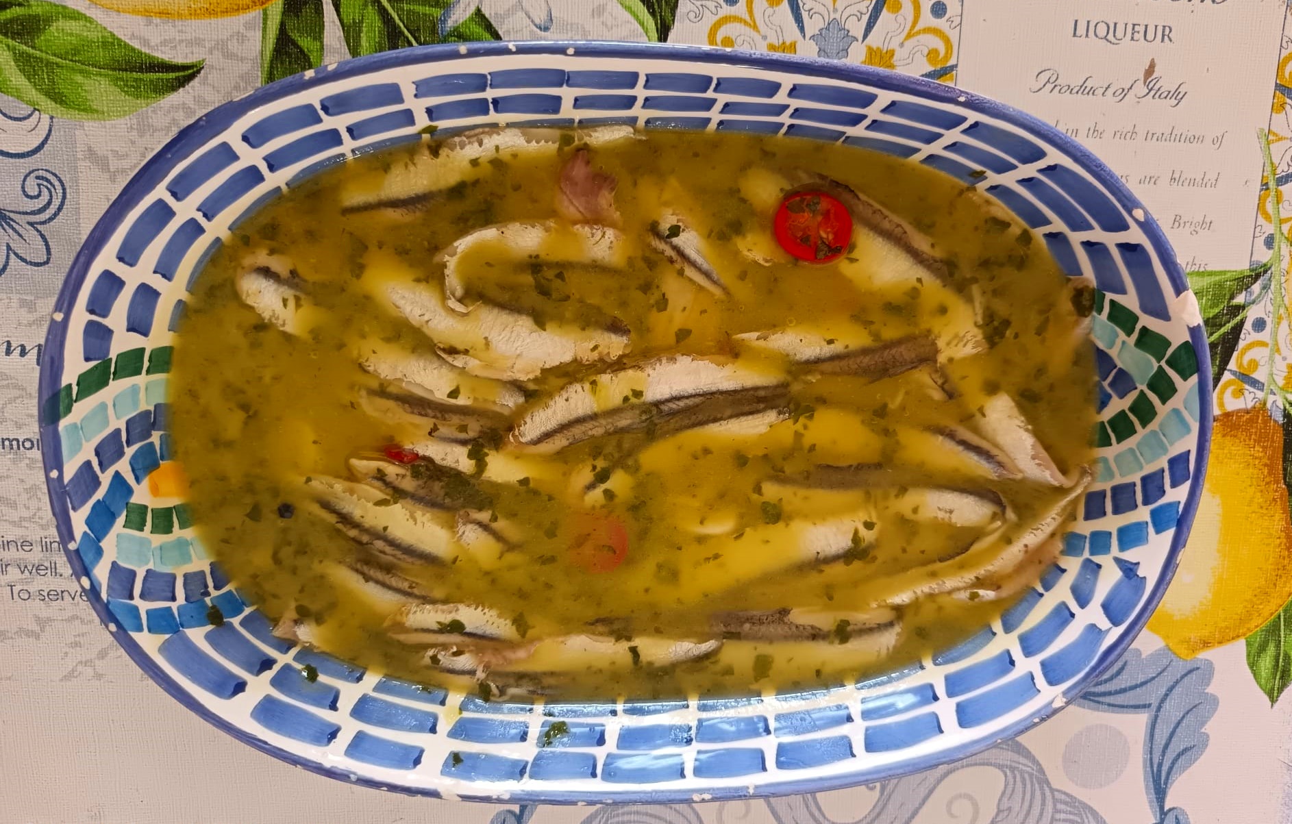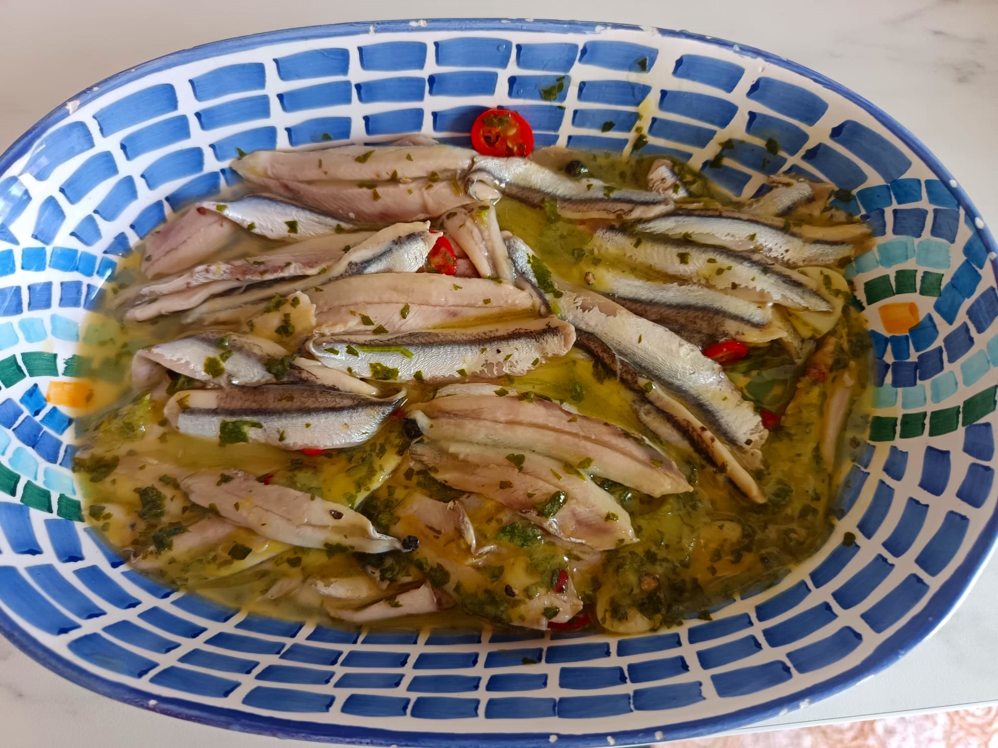 As “alici marinate” (anchovas ou aliche marinadas) são uma entrada fria, muito fácil de preparar, típica do litoral italiano e comida de verão. A marinada é uma técnica antiga para preservar e preparar alimentos, sem cozimento real, portanto se conservam na geladeira bem fechadas por alguns dias. O resultado é um prato fresco e saboroso com um sabor levemente ácido que é muito apetitoso.