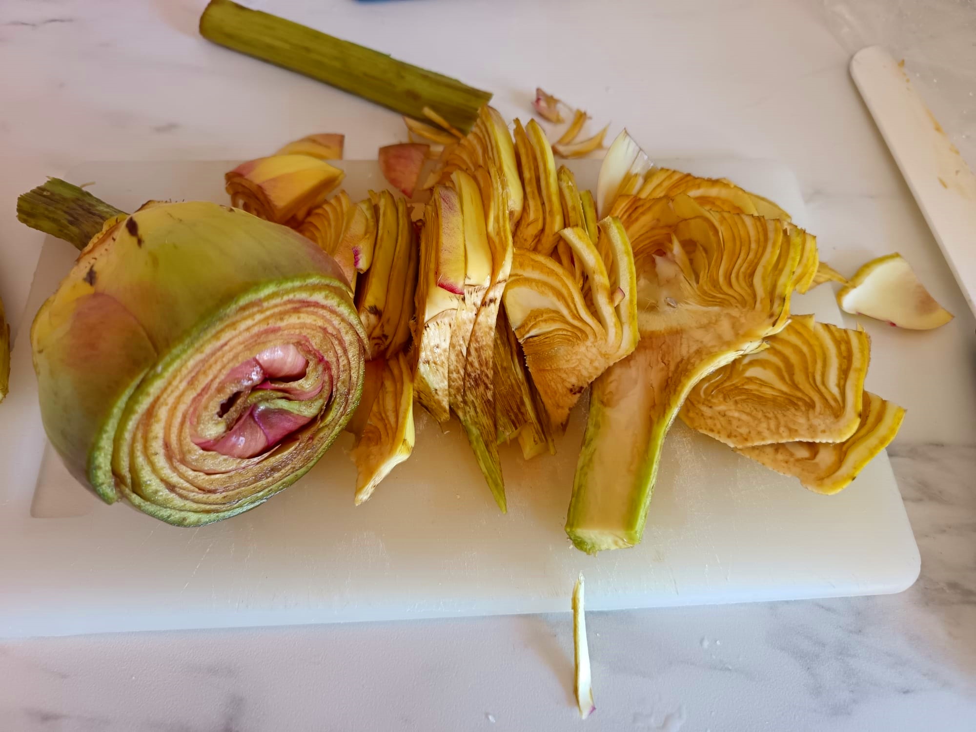 1. Tire as folhas externas das alcachofras, separando o coração. Corte o coração em tiras e ponha numa tigela com água fria e limão (Veja o vídeo abaixo).