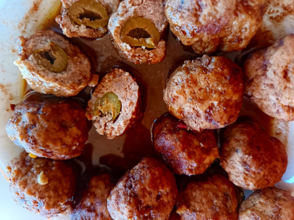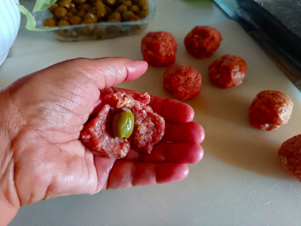 São pequenos bolinhos de carne com uma azeitona verde dentro, super saborosos, até para fazer sanduíches. O orégano dá um sabor especial à carne e com a azeitona parece comer as famosas “olive all’ascolana” italianas.