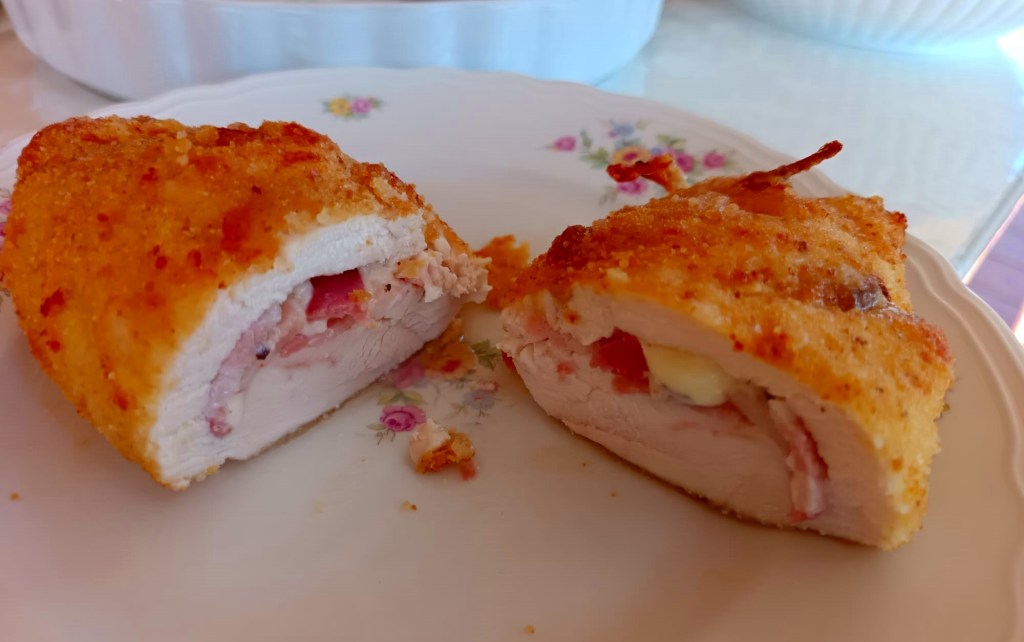 O Cordon Bleu tradicional é um bife à milanesa recheado com presunto e queijo. É uma receita clássica da cozinha francesa. Agora com a Air Fryer tudo fica mais fácil, é como se fosse frito, mas não é. Não use queijo fresco, prefira os de consistência mais firme. A minha versão é com o bacon cortado fininho.