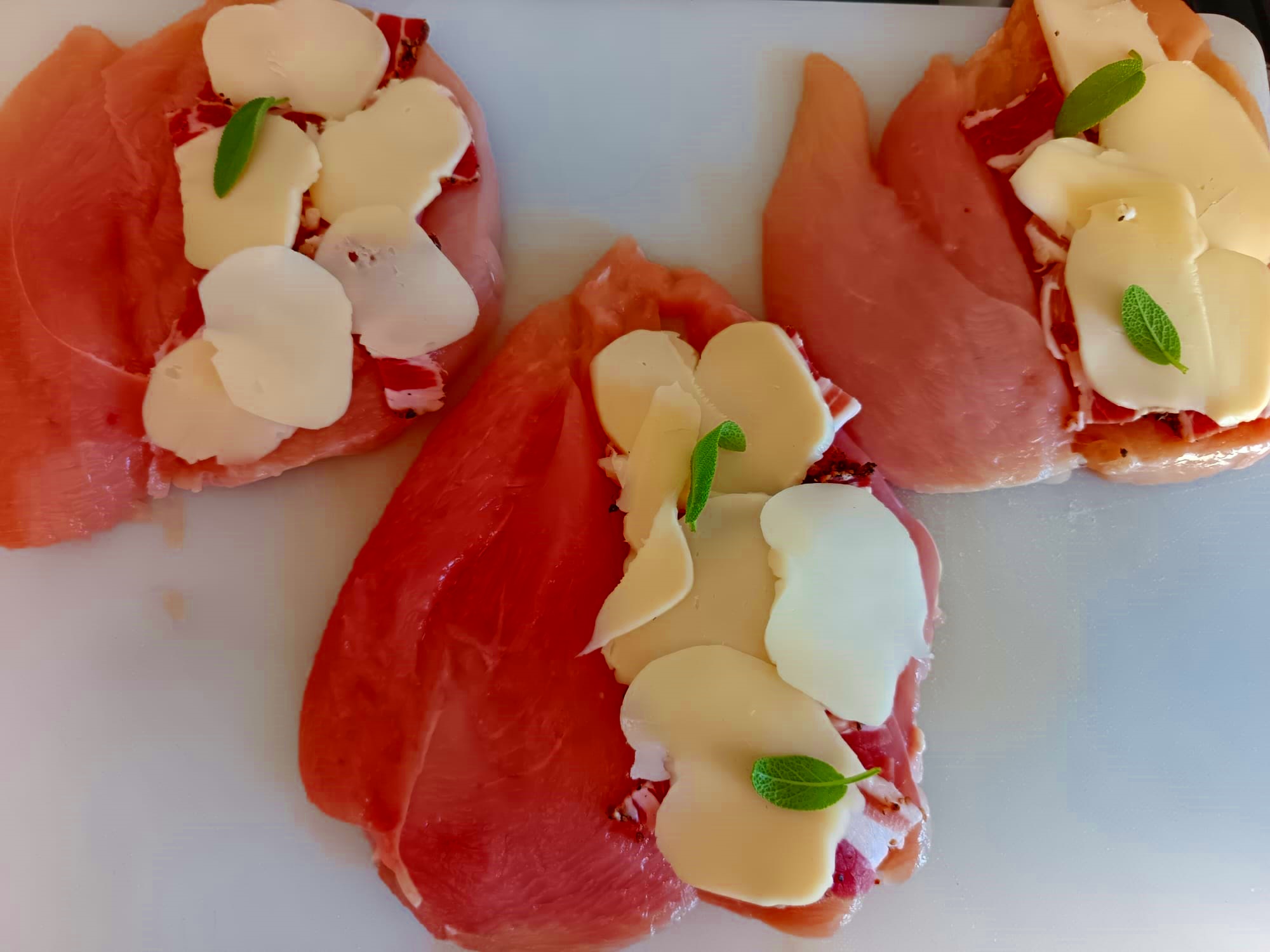 Coloque o bacon depois o queijo em fatias e a sálvia