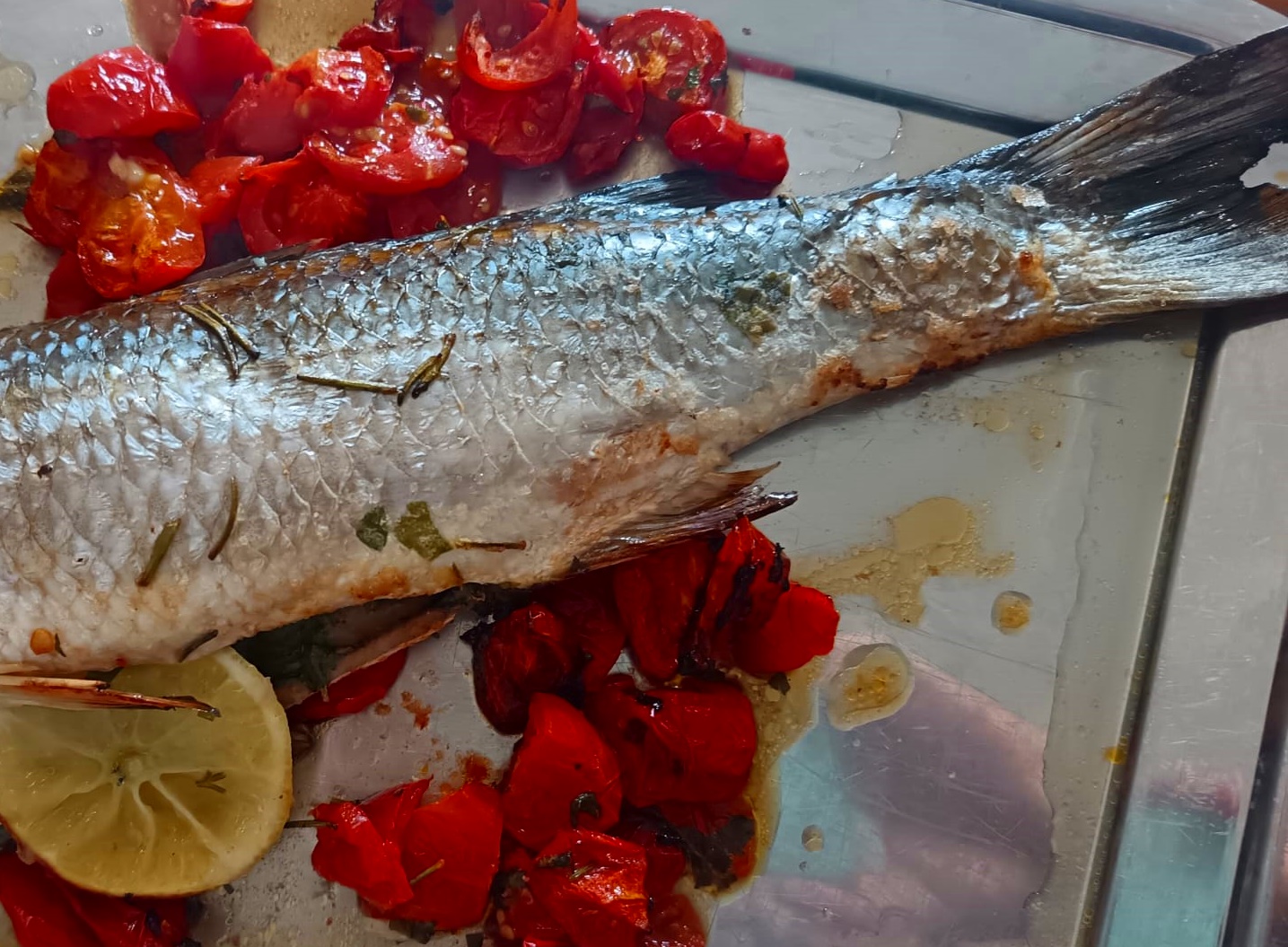 Tire a assadeira do forno e acomode o peixe temperado com algumas fatias de limão na barriga sobre os tomates.