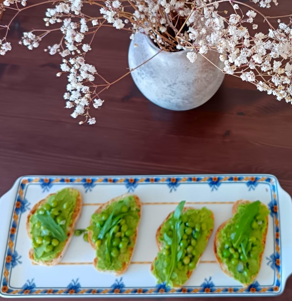 Uma entradinha perfeita para utilizar o pão que sobrou. As ervilhas frescas são maravilhosas, boas até cruas! Este crostino tem um sabor irresistível, o creme pode ser feito antes e na hora de servir é só passar no pão, montar e levar ao forno.