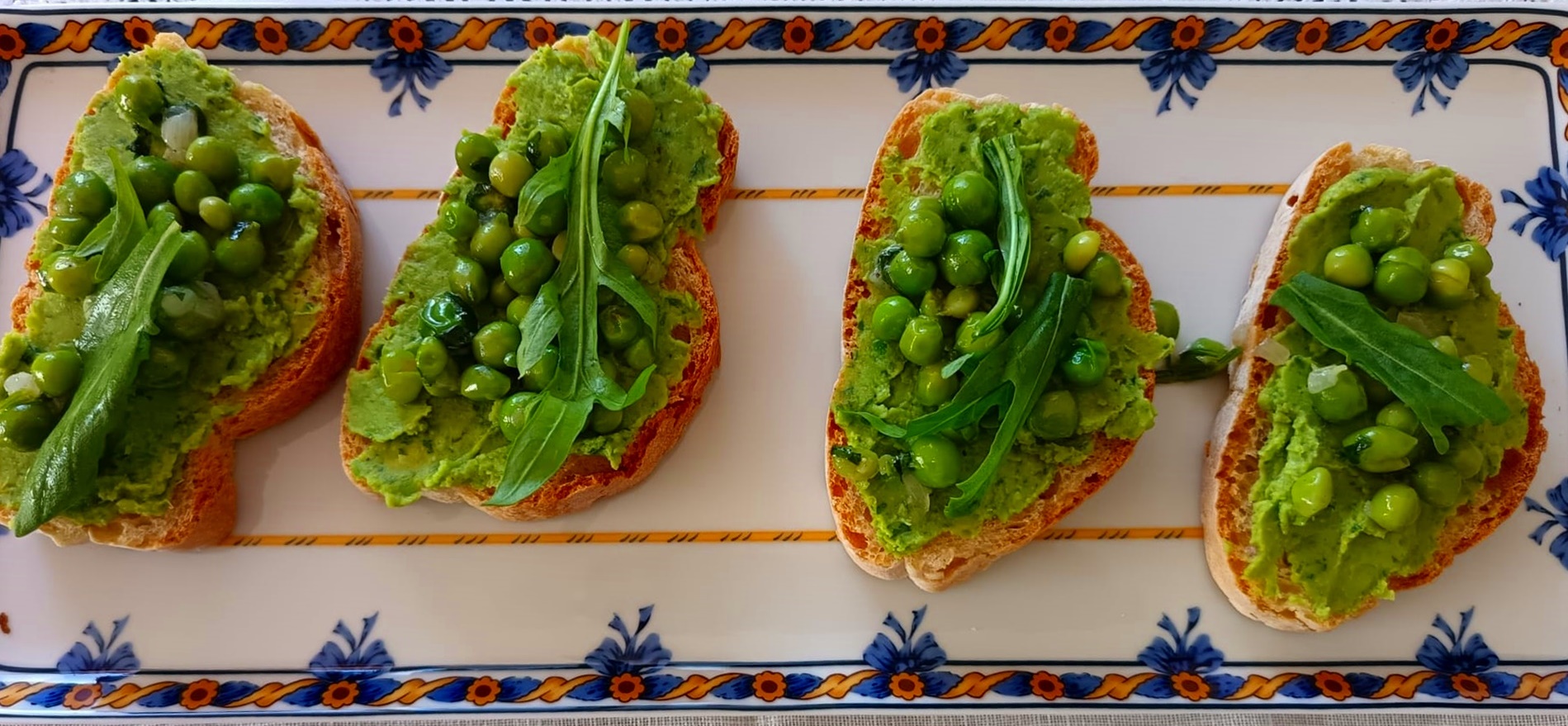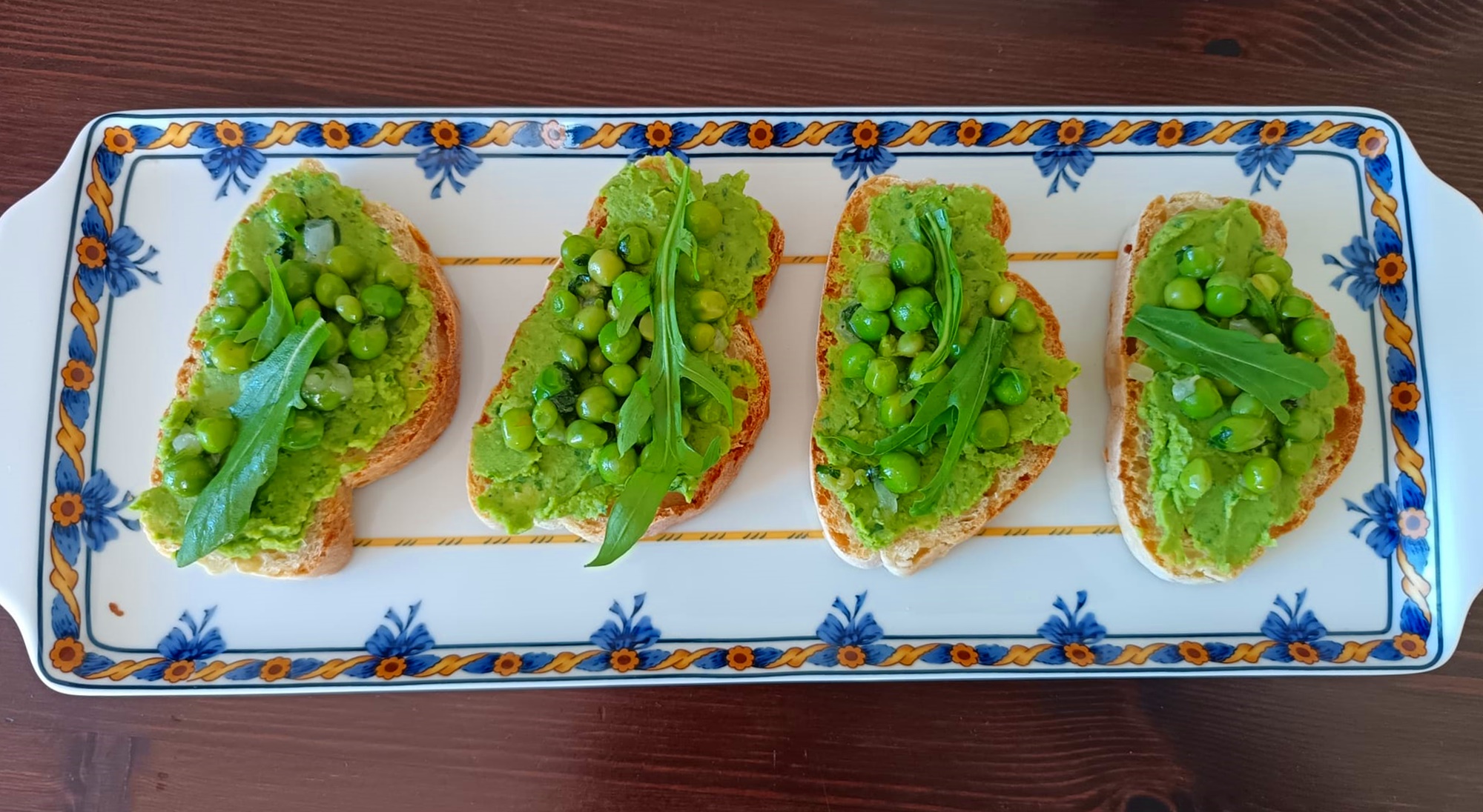 Uma entradinha perfeita para utilizar o pão que sobrou. As ervilhas frescas são maravilhosas, boas até cruas! Este crostino tem um sabor irresistível, o creme pode ser feito antes e na hora de servir é só passar no pão, montar e levar ao forno.