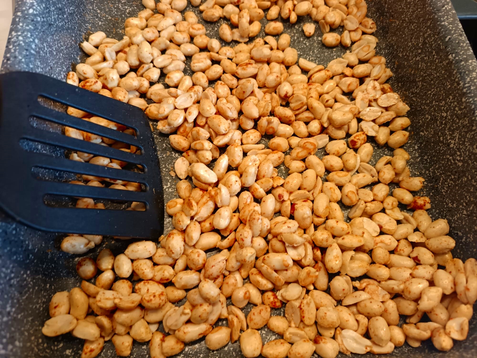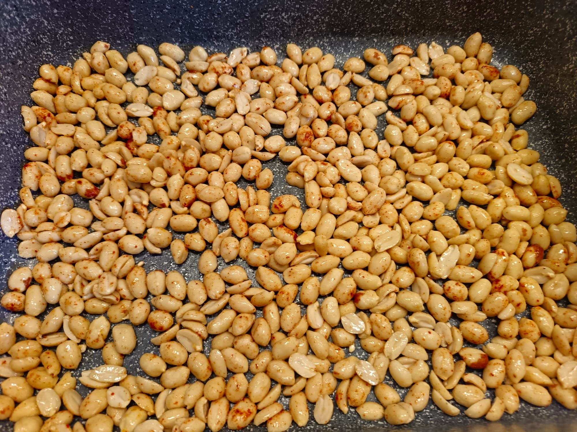 Bata a clara do ovo apenas o suficiente para formar uma espuminha. Agora junte os amendoins, o sal e a páprica, diria a gosto.